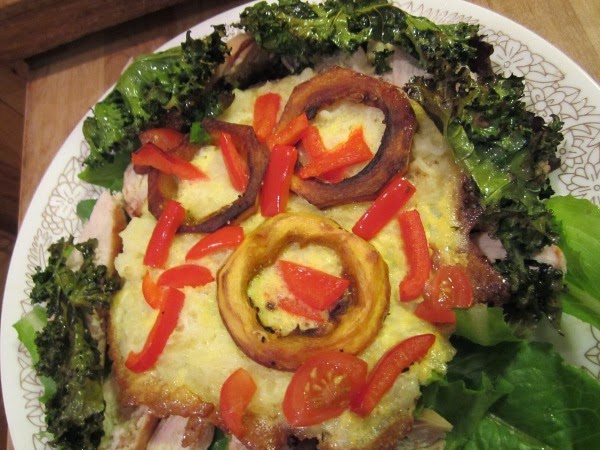Steam 1/4 small cauliflower until florets are tender. Puree the cauliflower with a bit of milk of your choice or farmer's cheese. Add salt and pepper to taste. Grill 3-4 asparagus spears. Spread cauliflower mixture on tart and top with asparagus. Place in the oven for a few minutes to warm your tart.